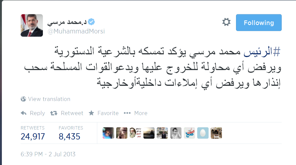 وفي مساء الثاني من يوليو، كتب مرسي علي صفحته على موقع “تويتر” داعيا القوات المسلحة إلى سحب بيانها، معلنا تمسكه بالشرعية الدستورية.