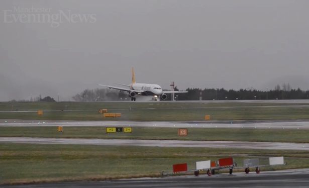 أظهرت لقطات فيديو عملية هبوط صعبة قام بها طيار شجاع أثناء عاصفة رياح ضربت مطار مانشستر في بريطانيا.