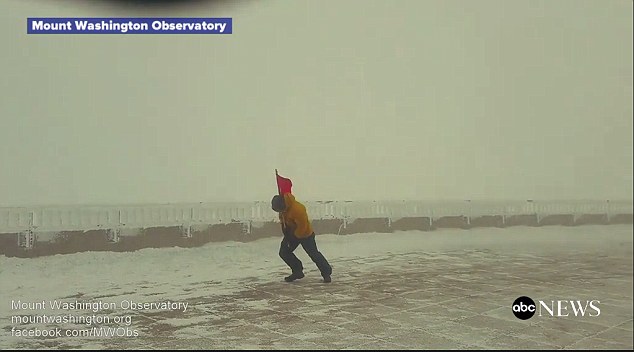وفي مقطع ثالث يظهر رجل في نيوهامبشاير وهو يقاوم الرياح بصعوبة شديدة أثناء محاولته سحب علم أحمر، لكن الرياح تطيح به في النهاية وتلقي به أرضا.