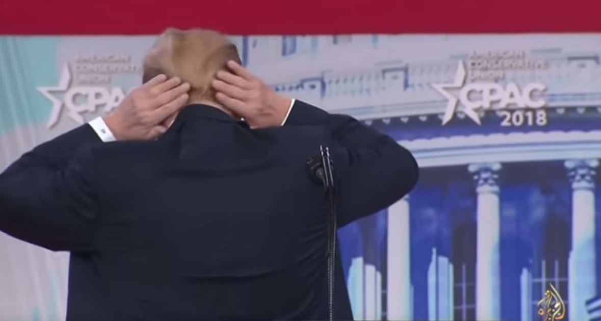شاهد: ترمب يحاول إخفاء صلعته والجمهور ينفجر ضحكا