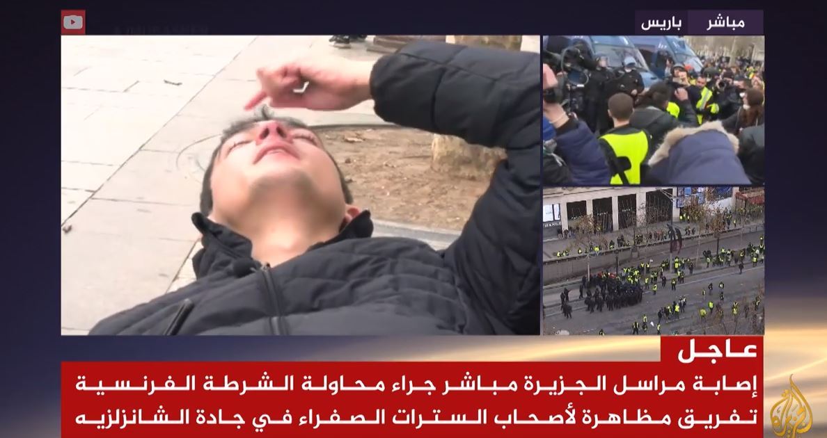 أصيب مراسل الجزيرة مباشر في باريس محمد الرماش أثناء تغطيته أحداث العنف الدائرة بين قوات الشرطة ومتظاهري “السترات الصفراء”.