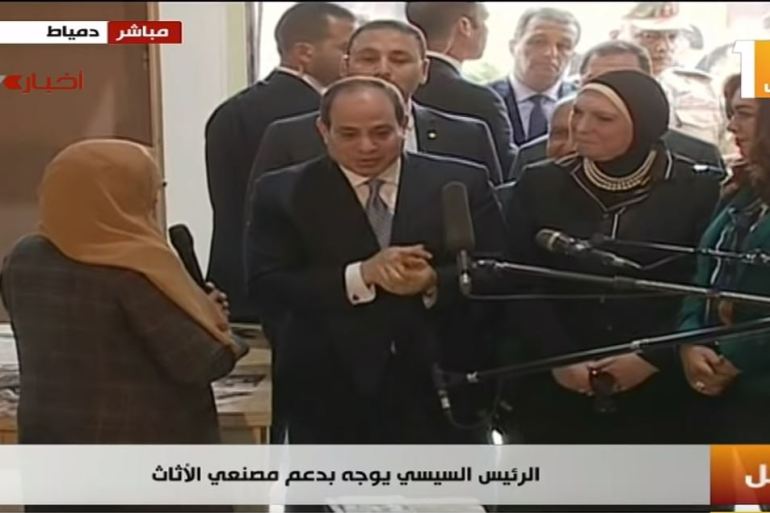 وكان السيسي يستعرض عددا من المشروعات، عندما التقى بصاحبة ورشتين للأثاث في مدينة دمياط للأثاث، ودار بينهما حوار لعدة دقائق.