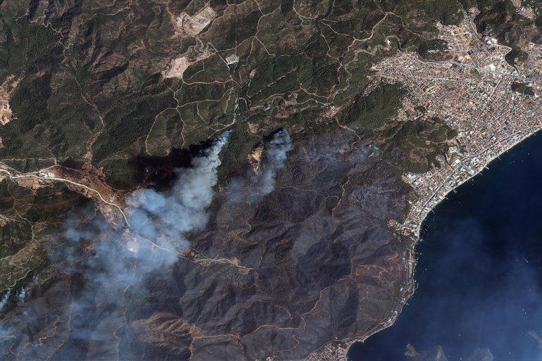التقط القمران الصناعيان التركيان (غوكتورك-1) و(غوكتورك-2) صورًا عالية الدقة من الفضاء لحرائق الغابات في ولايتي أنطاليا وموغلا.