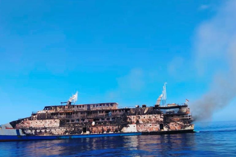 شاهد: النيران تلتهم سفينة إندونيسية ومسؤولون يكشفون مصير الركاب