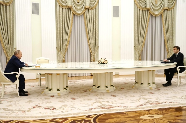 وصُدم المراقبون بصور ماكرون وبوتين وهما جالسان متباعدين عند طرفي طاولة طولها أربعة أمتار لبحث الأزمة الأوكرانية يوم الإثنين، مما دفع بعض الدبلوماسيين وآخرين للقول إن بوتين ربما يريد إرسال رسالة دبلوماسية.