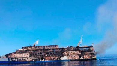 شاهد: النيران تلتهم سفينة إندونيسية ومسؤولون يكشفون مصير الركاب